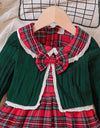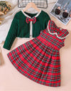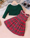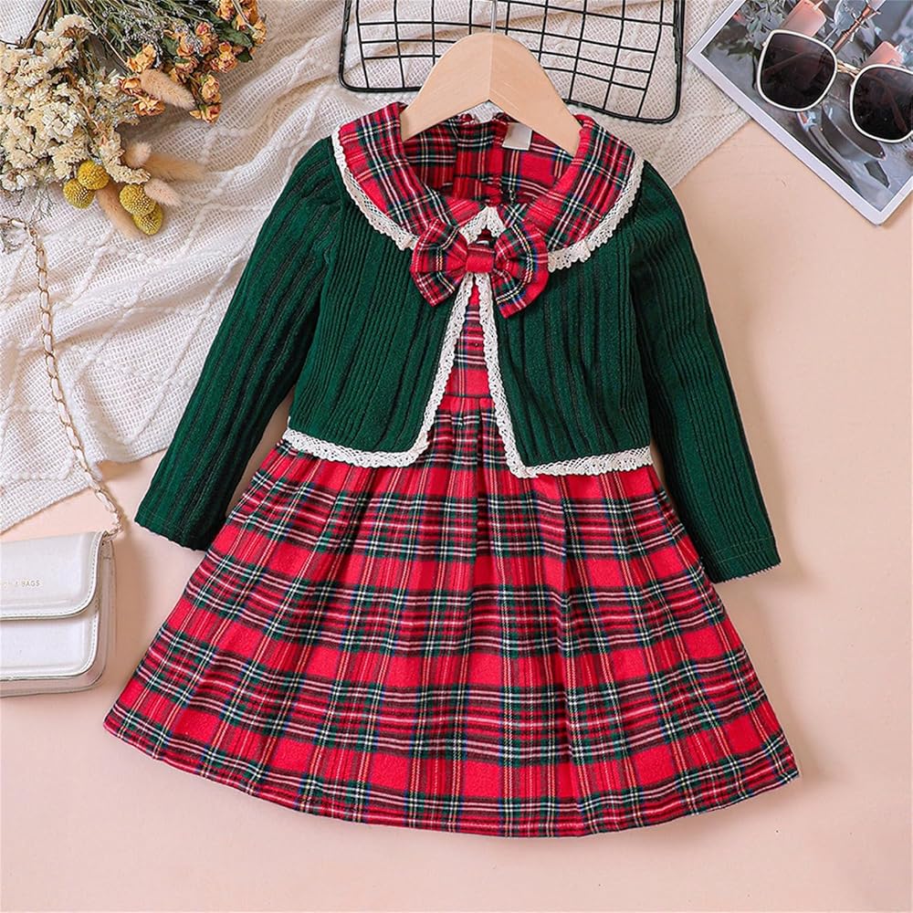 This charming ensemble features a stylish plaid dress with a lace trimmed collar and a back zipper for a perfect fit. The set is paired with a cozy long sleeved knitted striped jacket wth button closure and detachable bowtie. Overall, this set offers a blend of comfort and sophistication for any occasion.