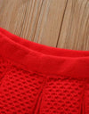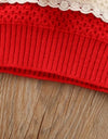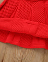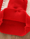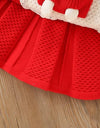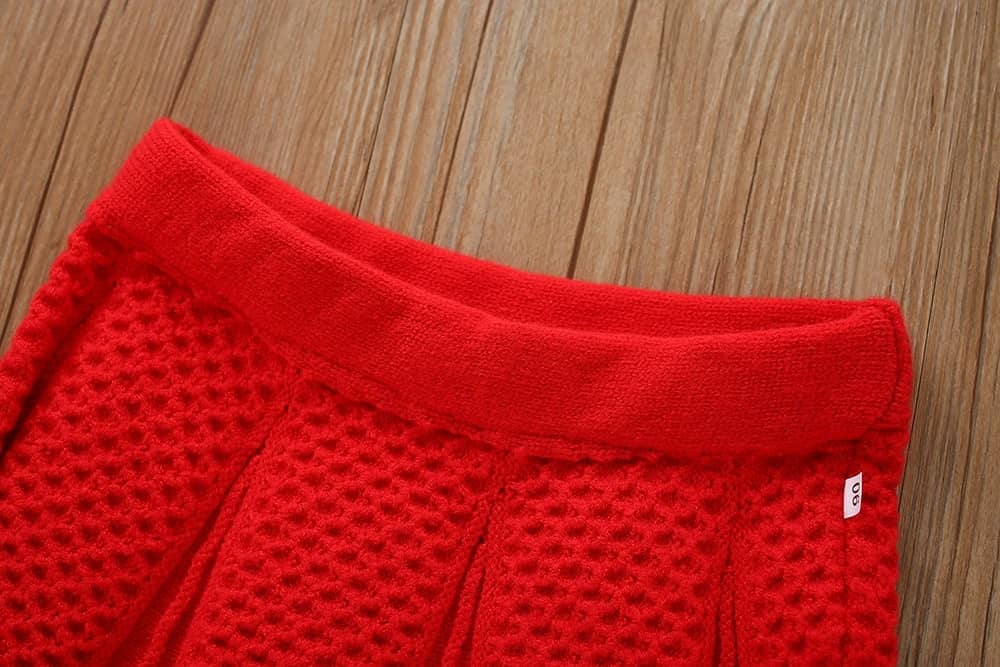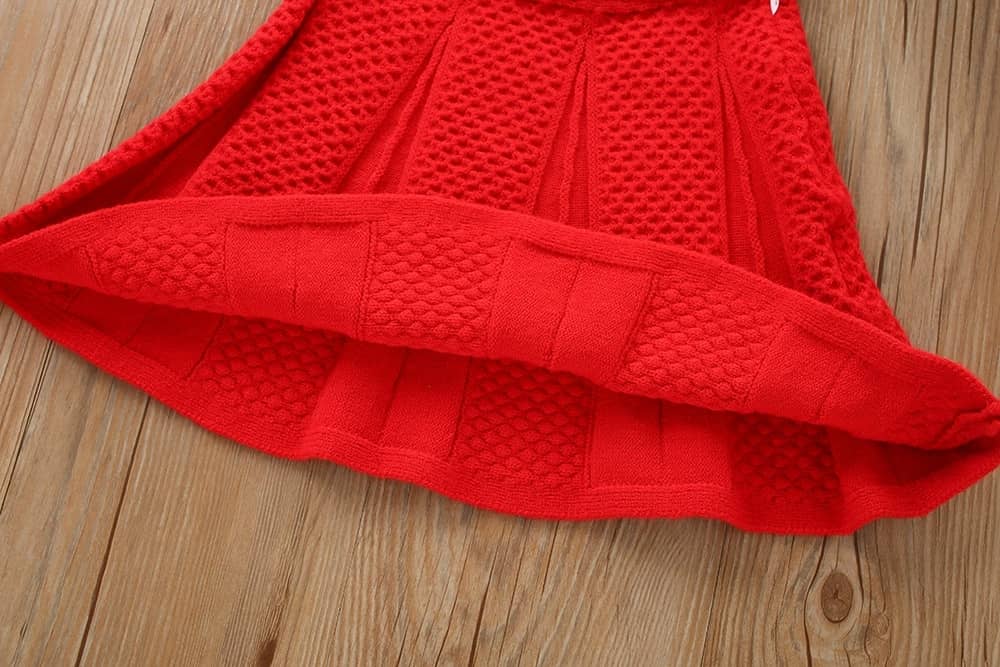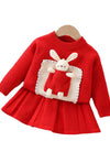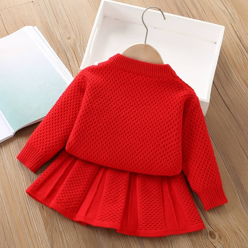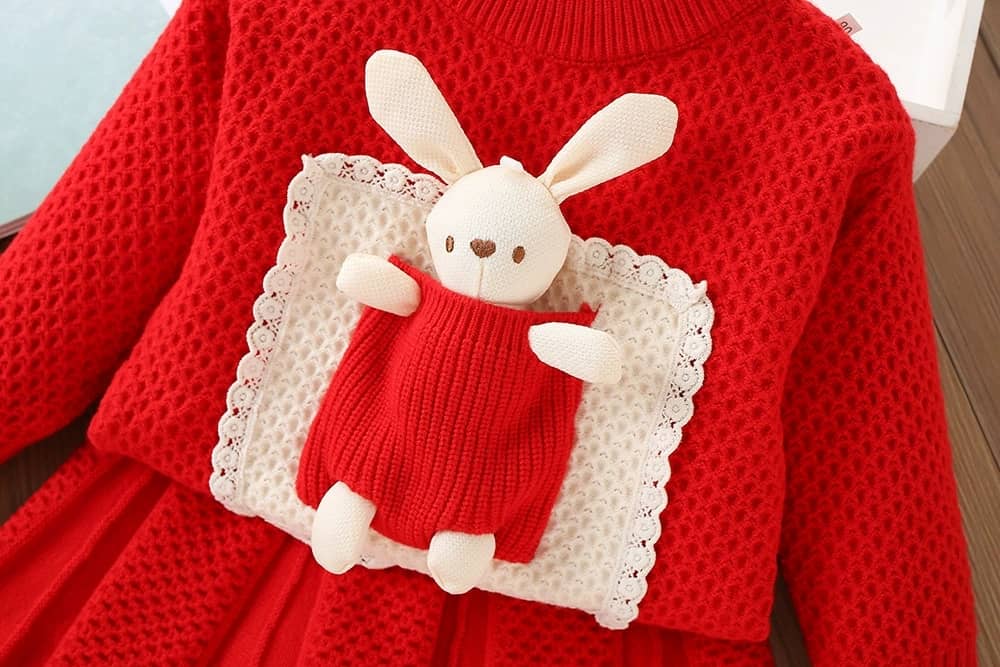 This cozy knit skirt and top set offers a warm and chic winter ensemble that also captures the charm of childhood play. The top features long sleeves and a round neckline, ensuring comfort and style. The highlight of this piece is the removable plush bunny, complete with a miniature house, which adds a whimsical and fun touch to the outfit. The pleated skirt provides a fashionable element, and completes the look. An absolute seasonal staple!