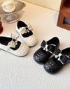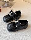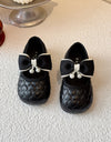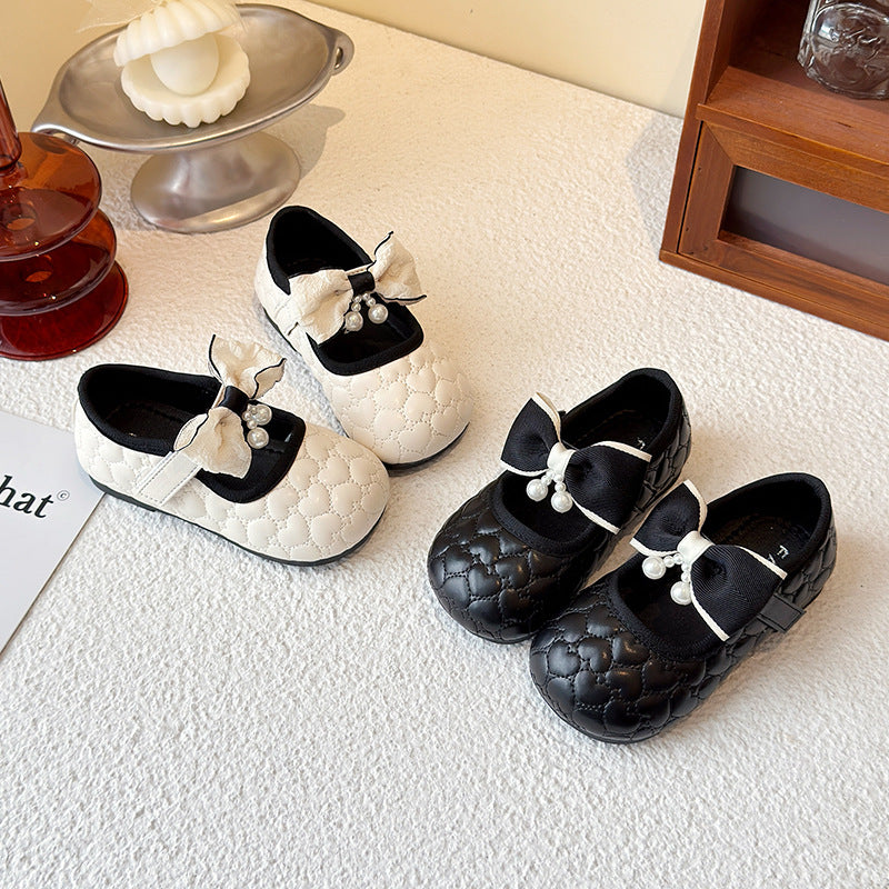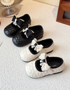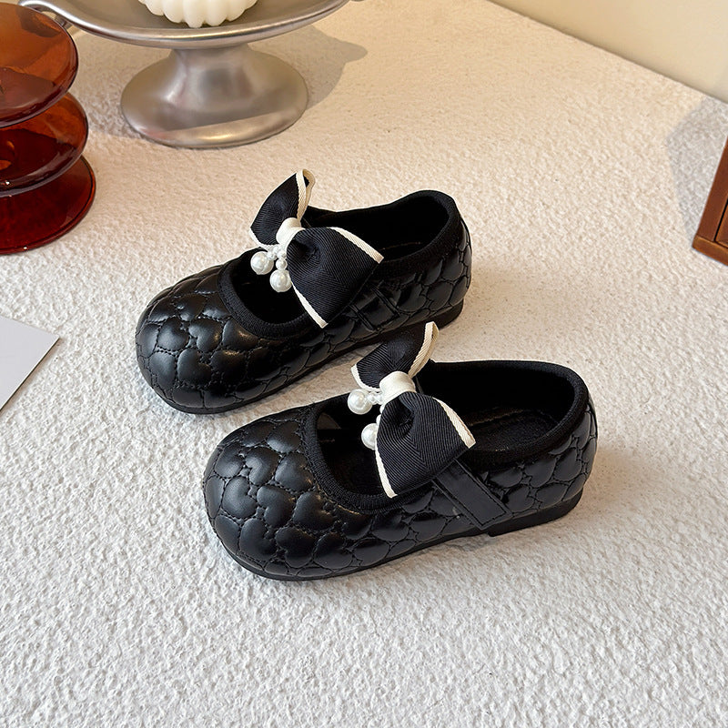 For the love of hearts and pearls! These charming shoes feature a quilted synthetic leather body, finished with a satin bow and pearl embellishments on the strap. Sturdy rubber soles provide comfort for all-day wear. Available in cream and black.