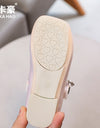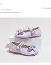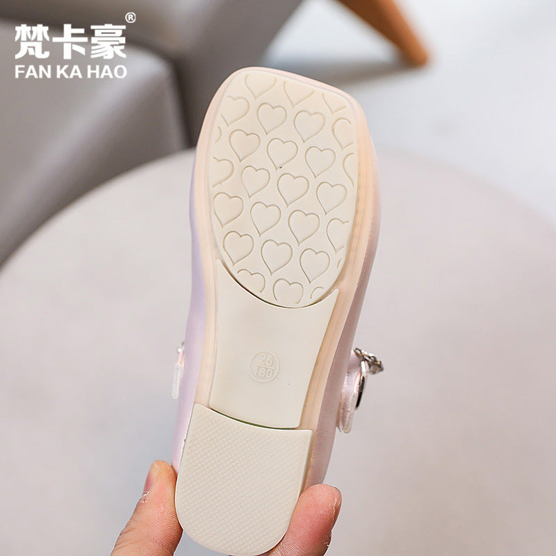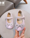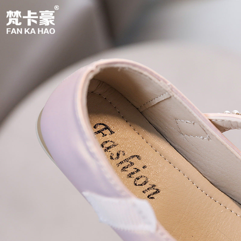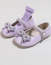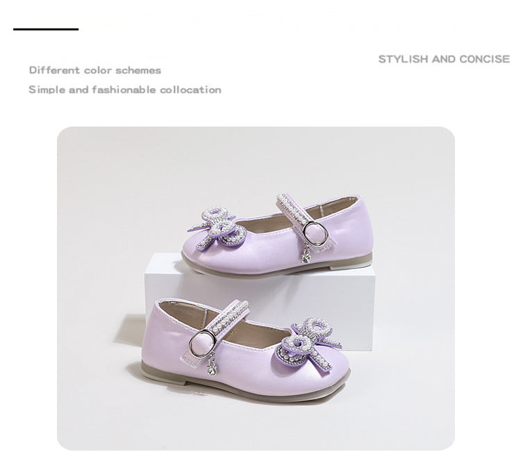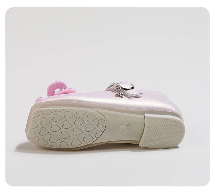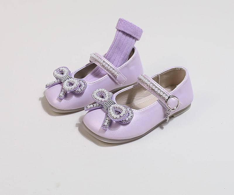 Beautiful girls shoes with a pretty bow design adorned in studs and beads. The leather of the shoe itself has a shiny disc look. The shoe fastens with a velcro strap that's also embellished with studs and pearls. A shoe for a true princess!