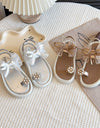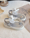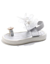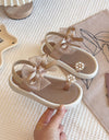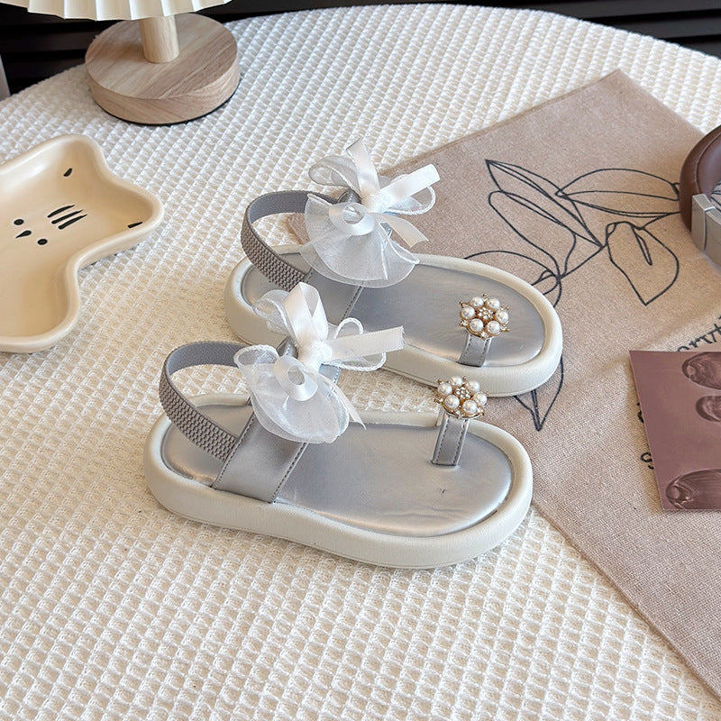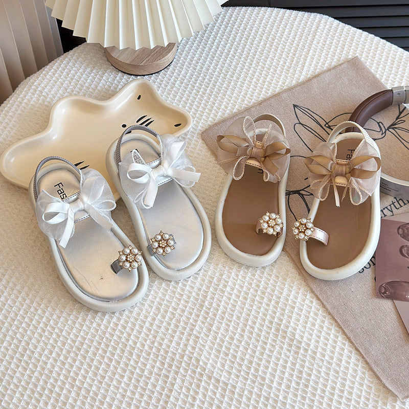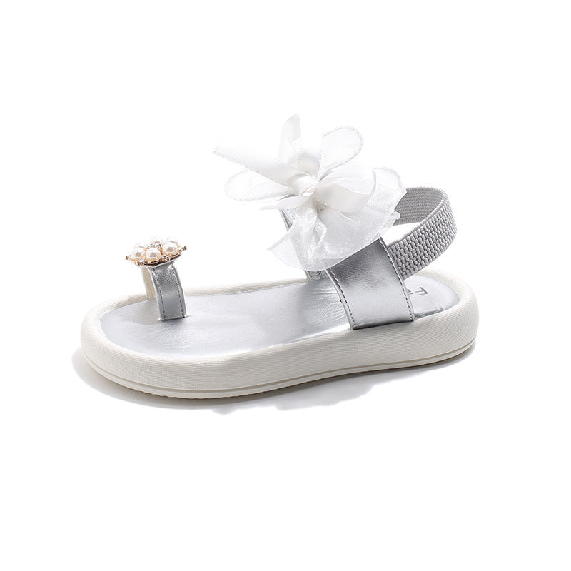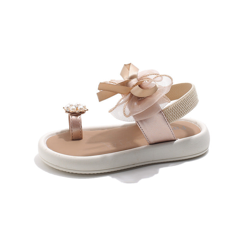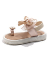 These sandals features a platform sole, a toe ring adorned with pearls, and a decorative bow in the middle. A perfect summer staple!
