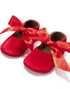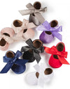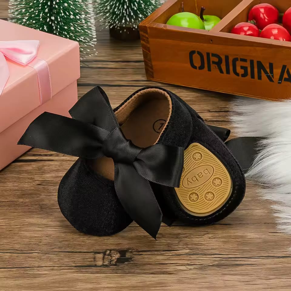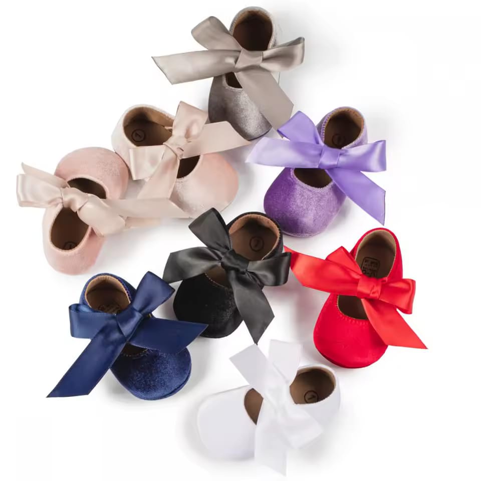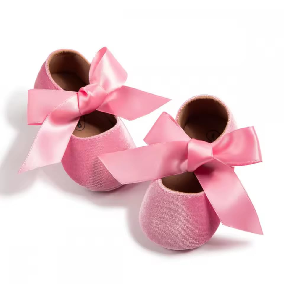 Sweet and stylish baby pumps shoe style with velvety touch feel and a beautiful satin ribbon bow, The ribbon can be styled freely and knotted over your little one's cute feet and keep it on all day long. The non-slip grip feature makes it a safe pair for your little one. Available in beautiful color variants.